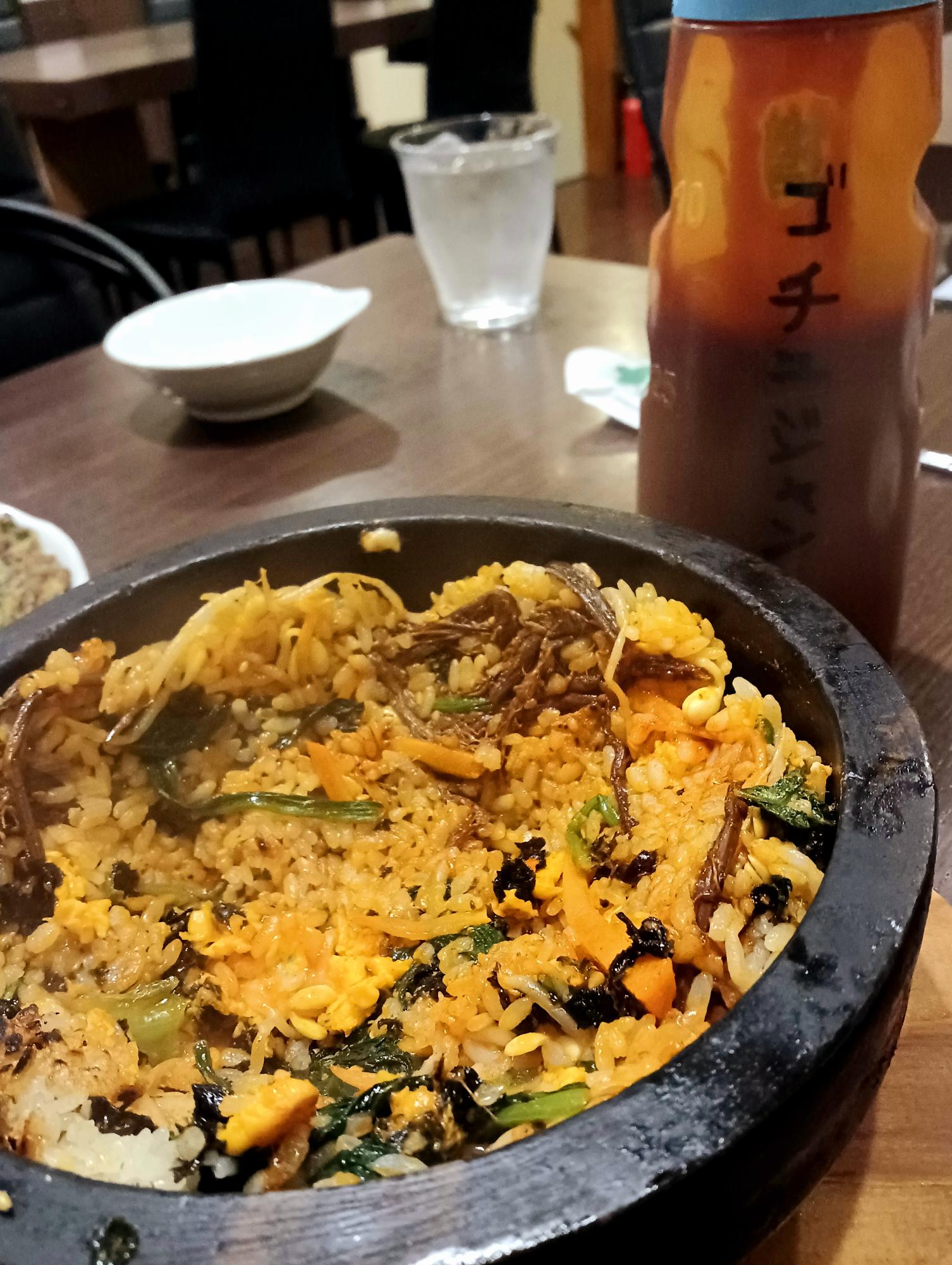 コチュジャンを入れて食べてねと、出されたコチュジャンは特大容器!ご飯をぱりぱりにするのが筆者の好みのため、よく混ぜて石鍋に広げ、こんな感じに。