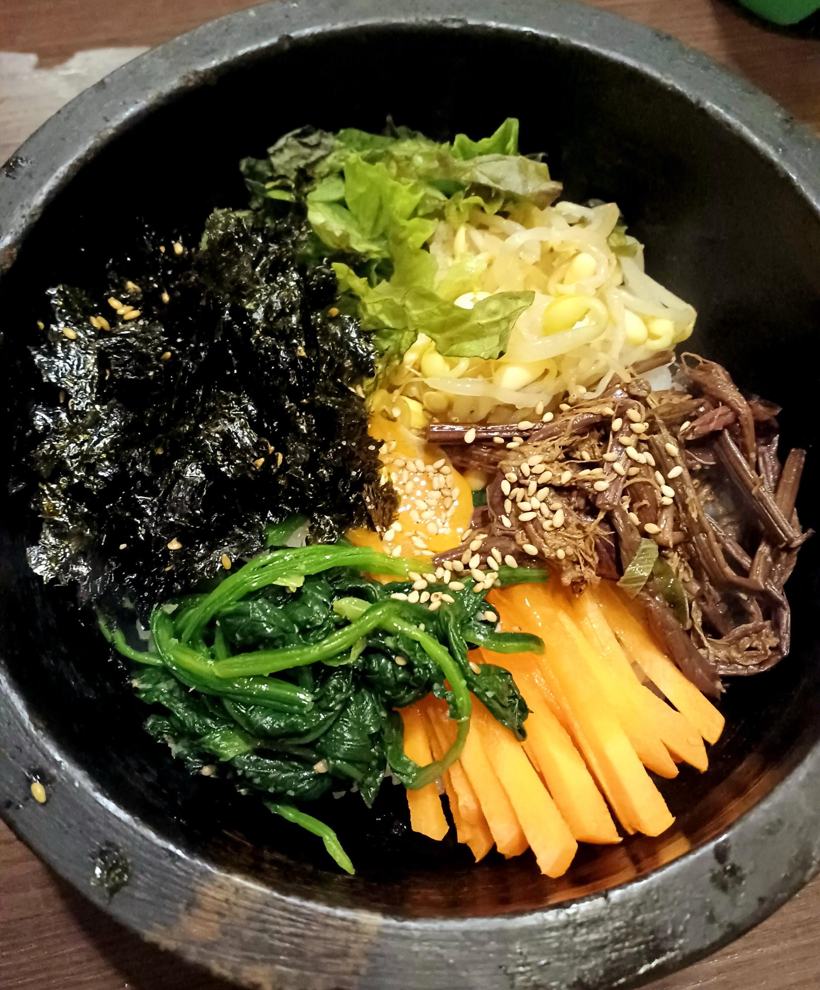 待ってました、主役の石焼ビビンバ。野菜たっぷり、韓国のりも入っています。
