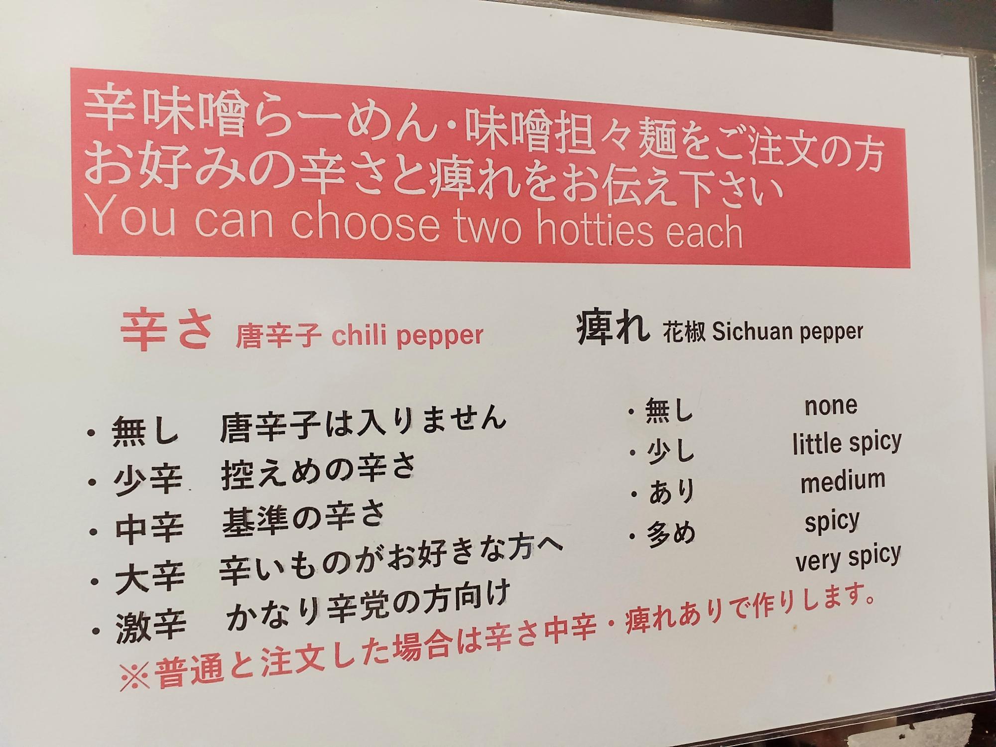 このところ担々麺を求め歩いている筆者は「味噌担々麺」をセレクト。「辛味噌らーめん」や「味噌担々麺」では、辛さ(唐辛子)と痺れ(花椒)が選べます。「味噌担々麺」を中辛(基準の辛さ)・痺れあり(medium)で注文。