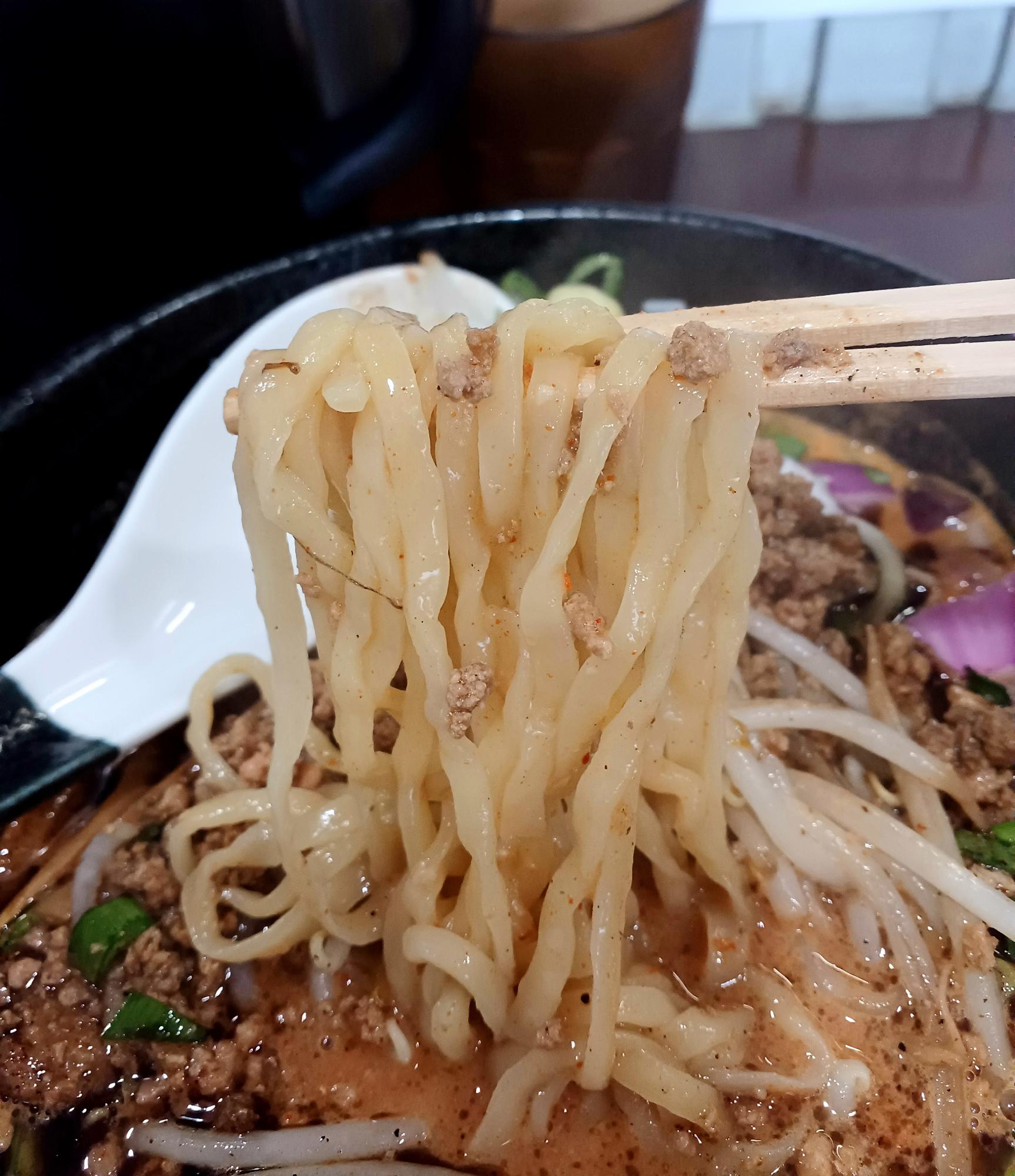 中華鍋の強い火力で炒められたもやしが、町中華のような素直な味わいと安心感をもたらしています。麺はやや平打ちのやや縮れで、ひき肉と唐辛子がよく絡む。味噌を存分に味わいます。