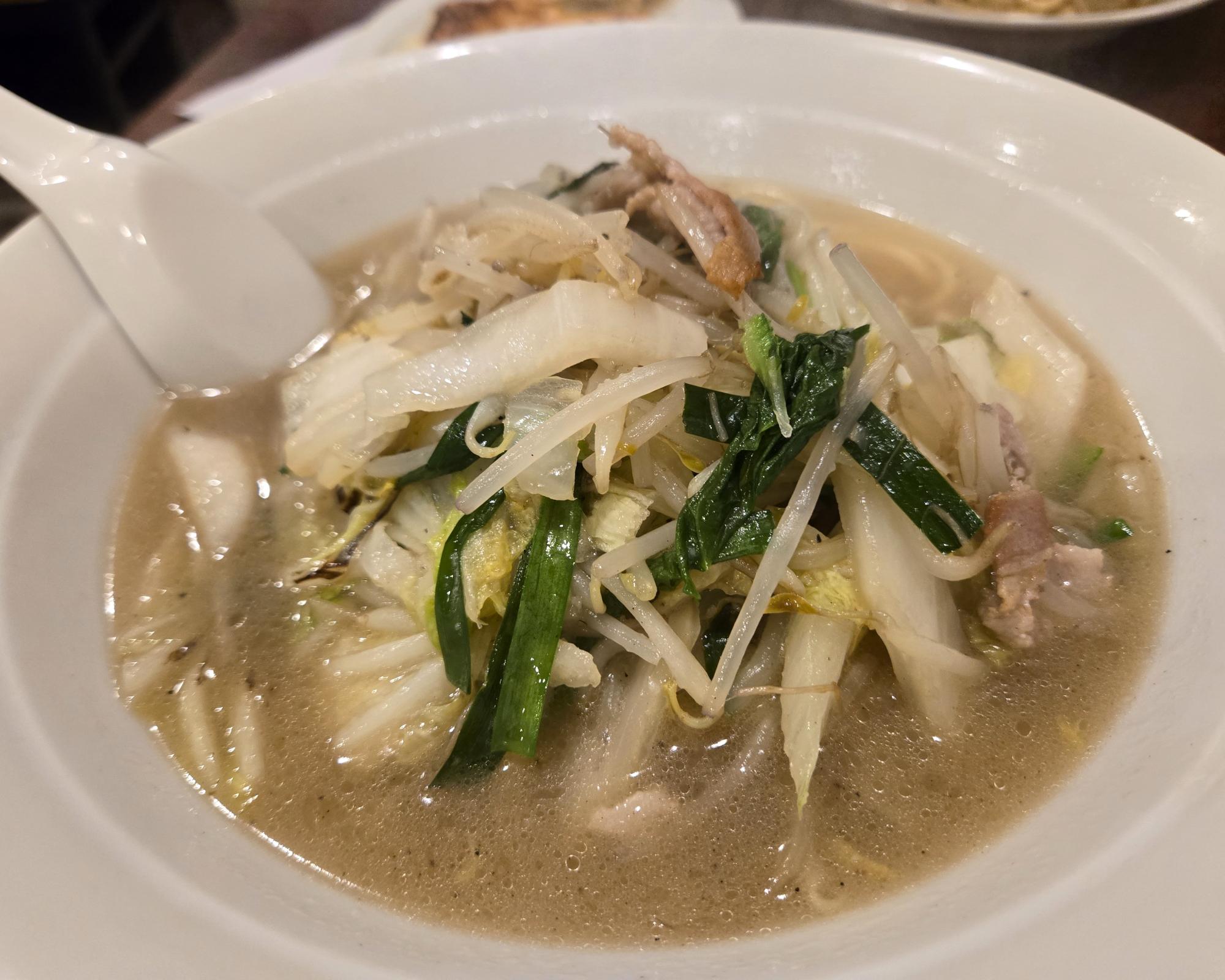 本日の主役、「たんめん」です。じつは店に入ったときから、ニンニクの香りを感じていた。たんめんの到着は、湯気とニンニク感の到着でもある。