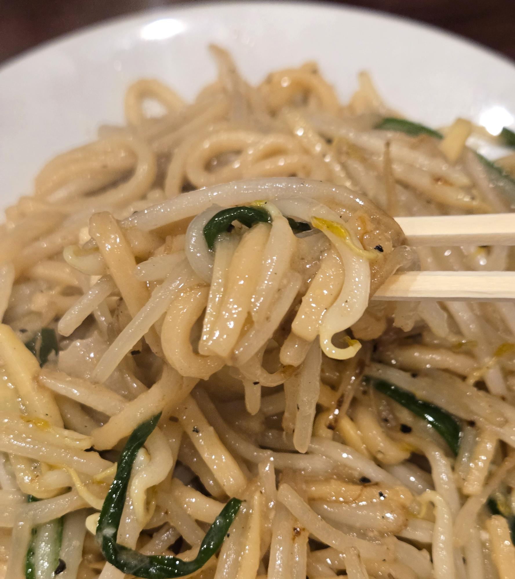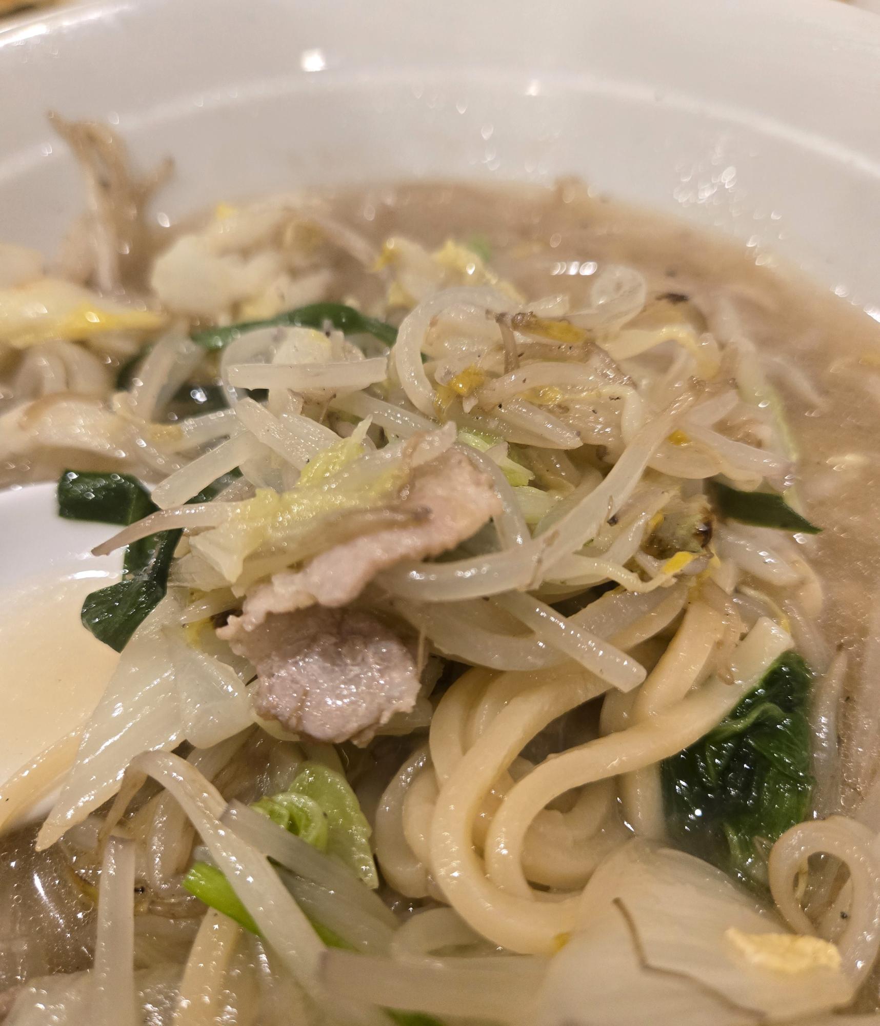 まず、器が大きい。そして野菜が多い。白菜、モヤシ、ニラ。箸の一挿しで、大量の野菜が持ち上がる喜び。ヘルシーとカロリーの両方を追い求める筆者にとって、願ってもないことである。