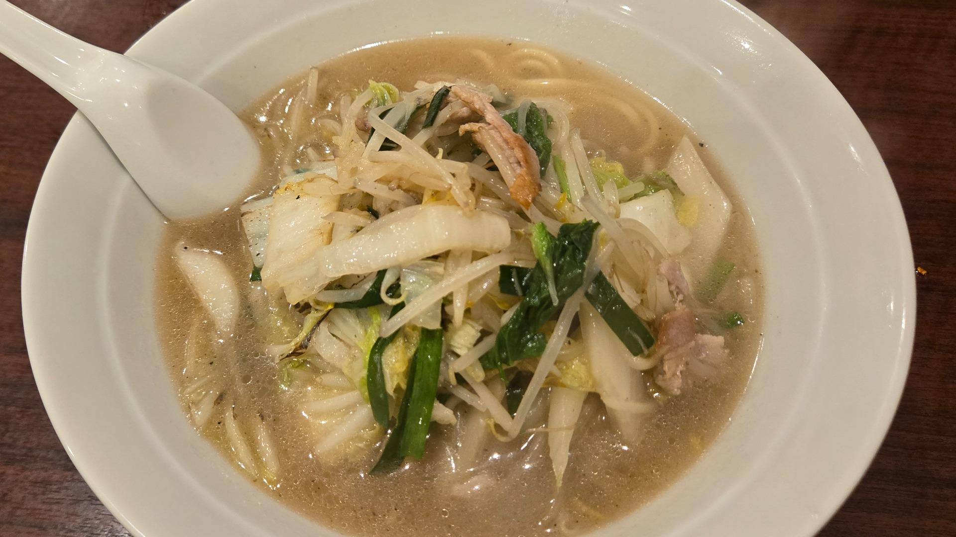 本日の主役、「たんめん」です。じつは店に入ったときから、ニンニクの香りを感じていた。たんめんの到着は、湯気とニンニク感の到着でもある。