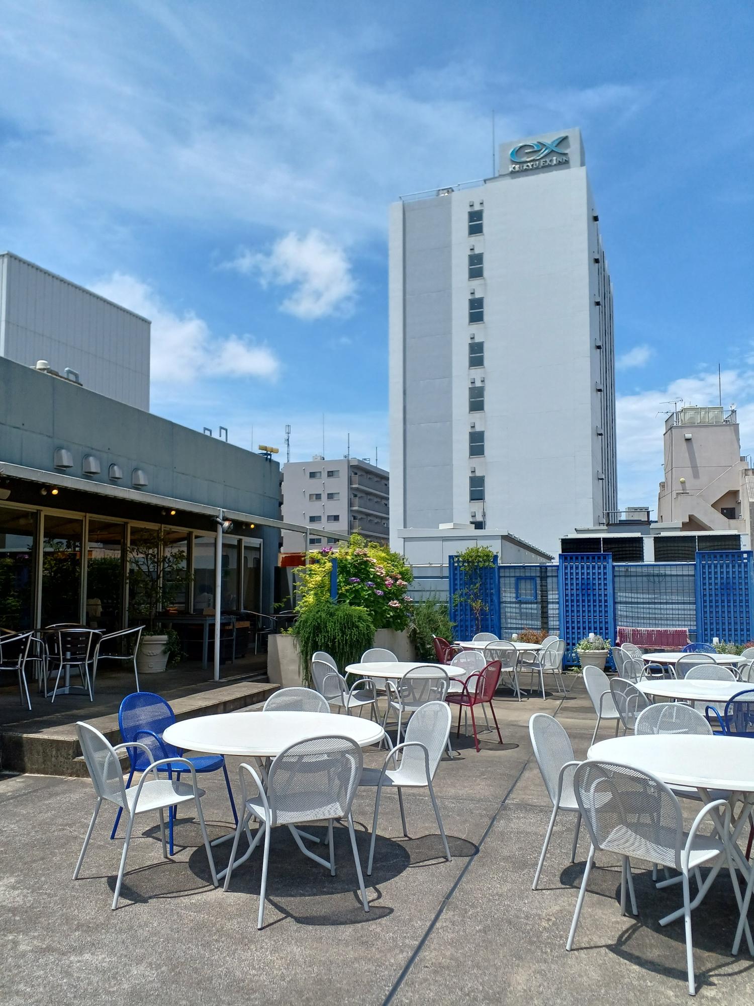ビルの屋上にテーブル席もある店舗。BBQなどのコースメニューも充実しています。
