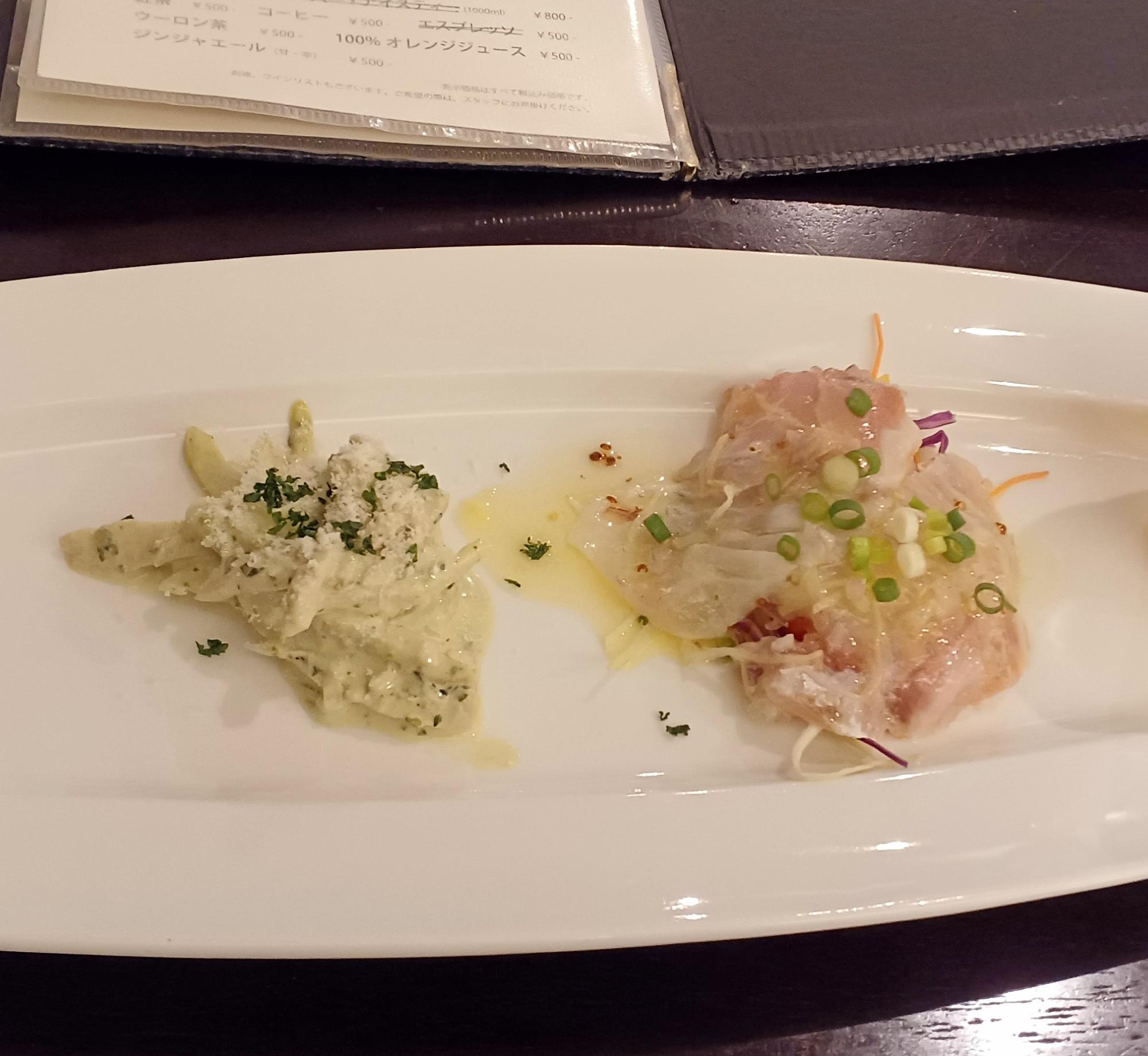 カルパッチョとチキン。ジェノベーゼやパセリなど、野菜の香味がふんだんに使われており贅沢な気持ちに。