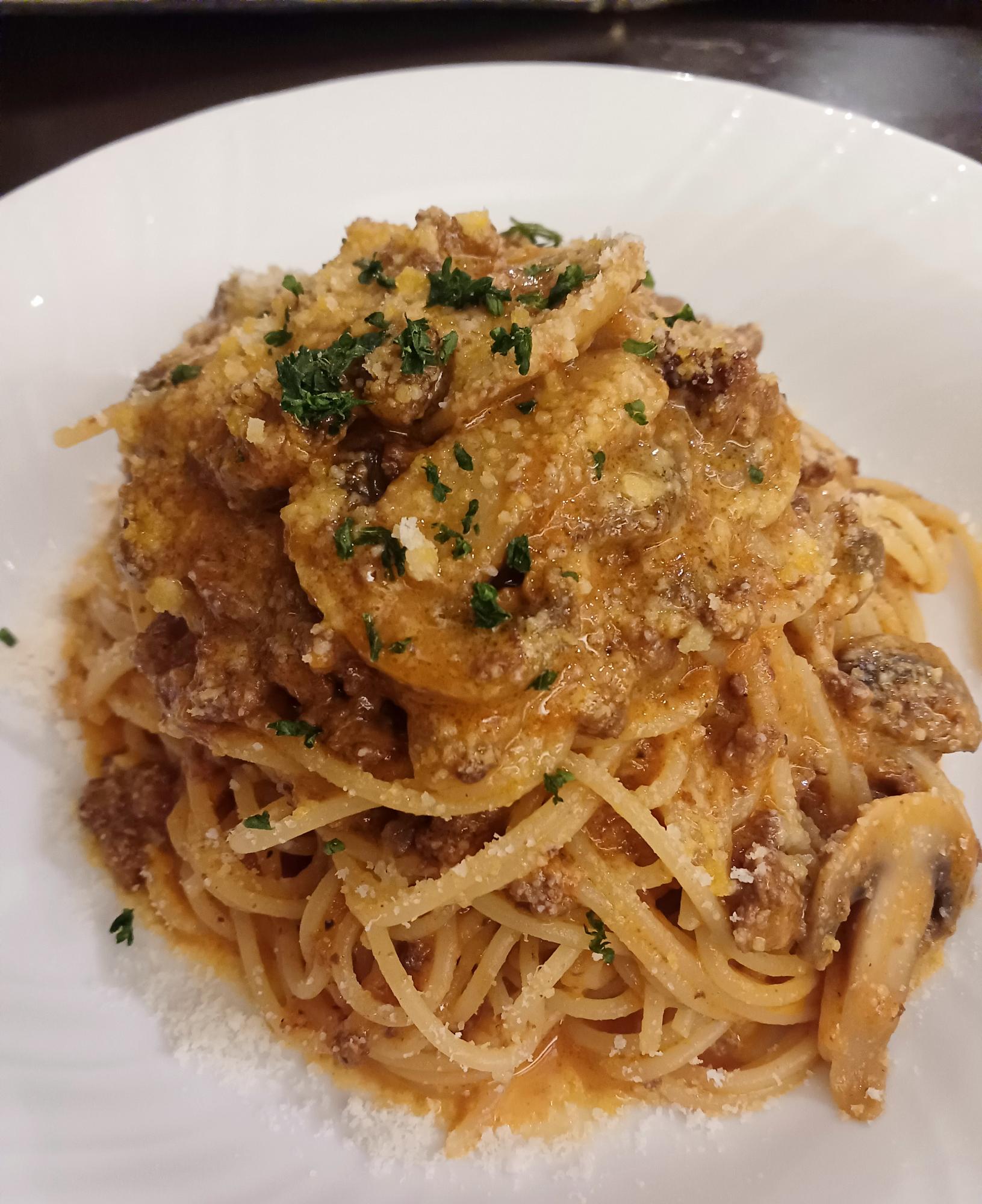 ボロネーゼパスタは、マッシュルームがたっぷりと入った贅沢な一品。満腹、満足。