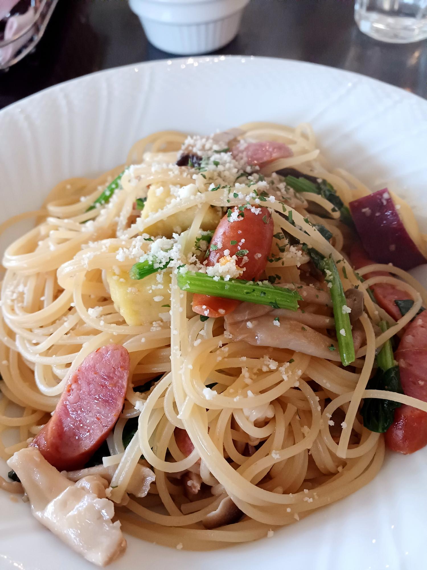 チョリソーとキノコのオイルソースパスタ。