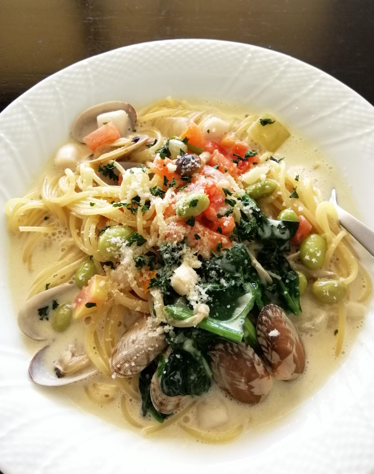 ランチメニューはパスタやお肉など。前菜やデザートが付く、ランチコースも選べます。たとえば、「はまぐりとしらす」の冷製パスタ(季節により提供有無あり)。