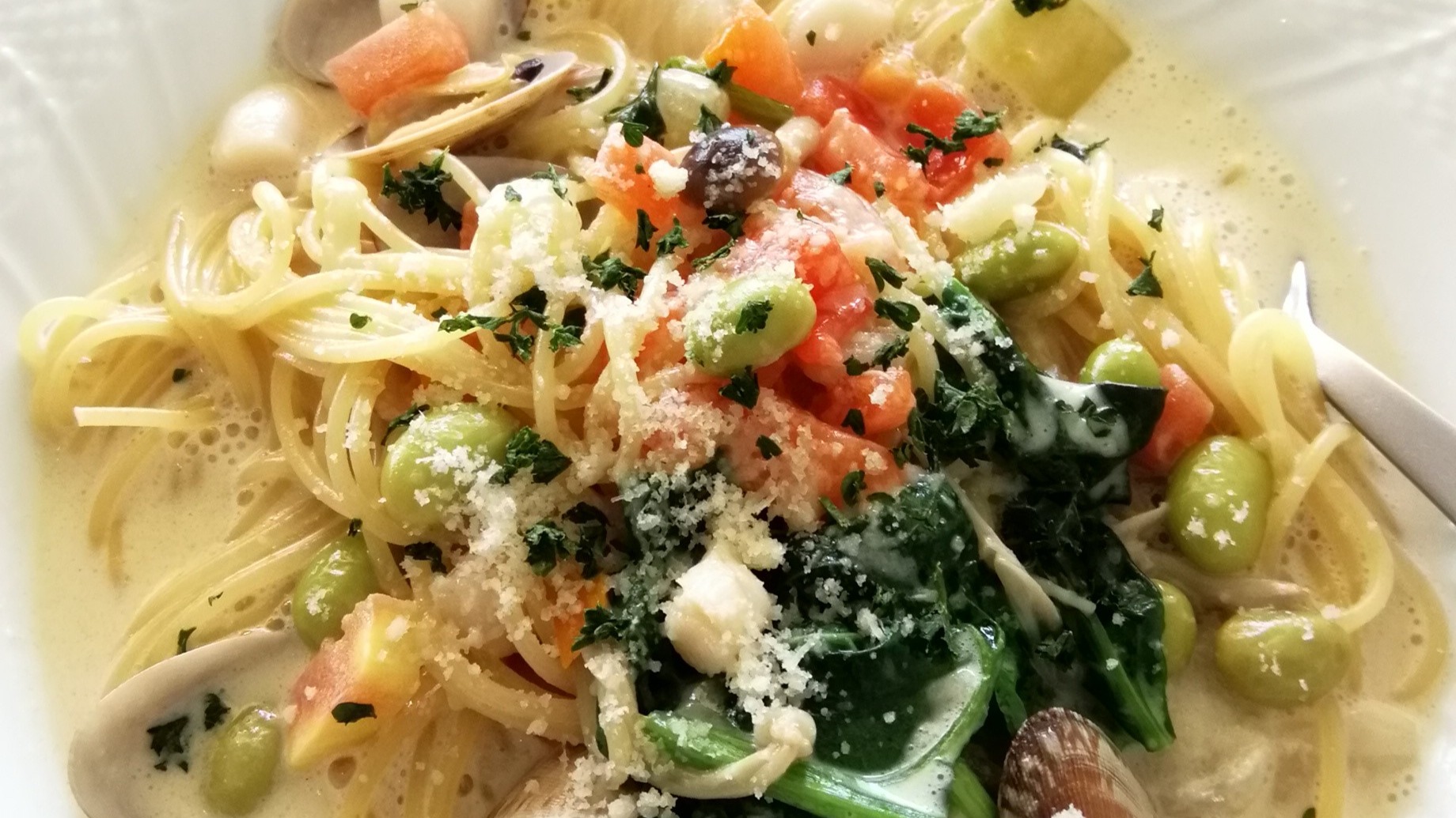 ランチメニューはパスタやお肉など。前菜やデザートが付く、ランチコースも選べます。たとえば、「はまぐりとしらす」の冷製パスタ(季節により提供有無あり)。