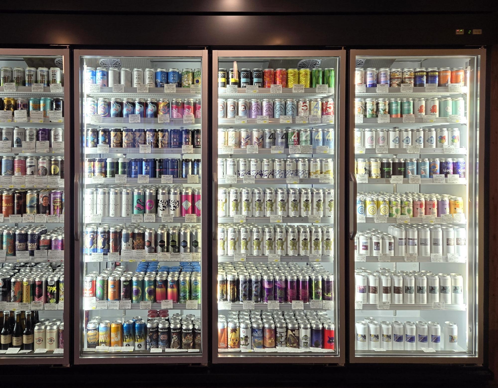 一歩入ればお待ちかねの風景が!クラフトビールがぎっしりとつまった、11台の冷蔵庫が並ぶ。