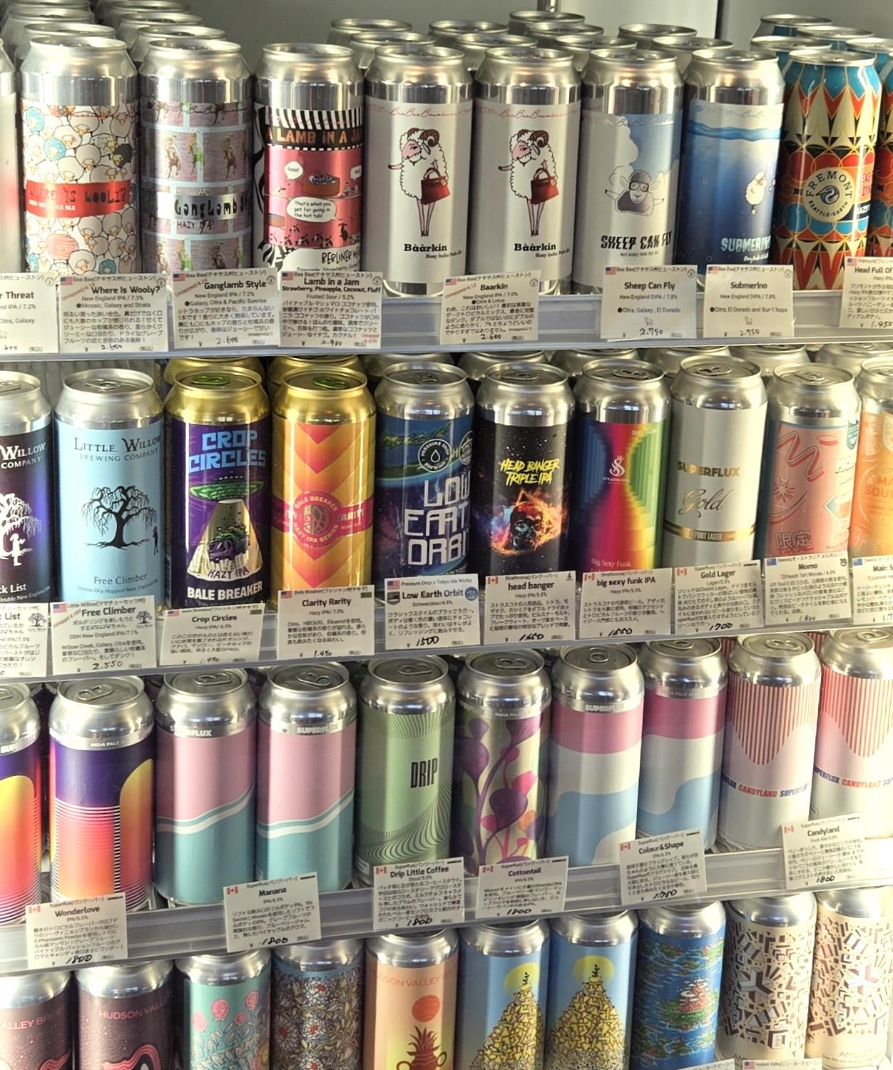 世界各国のビールが並ぶ風景は、さながら万国博覧会のよう。こちらはアメリカにカナダ。