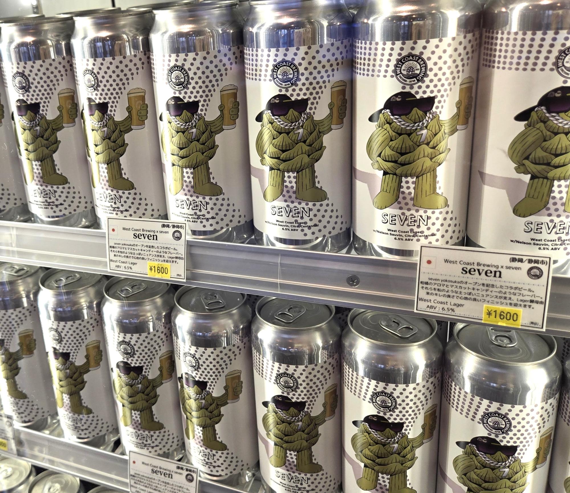 オープン記念ビールには、缶バージョンもある。ウエストコーストブルーイングではお馴染みのホップのキャラクターが、数字の「7」のネックレスをつけたりと、「セブン」仕様のファッションに身を包んでいる。こちらの缶はハンマーヘッドのコンビニ店舗でも購入可能とのこと。