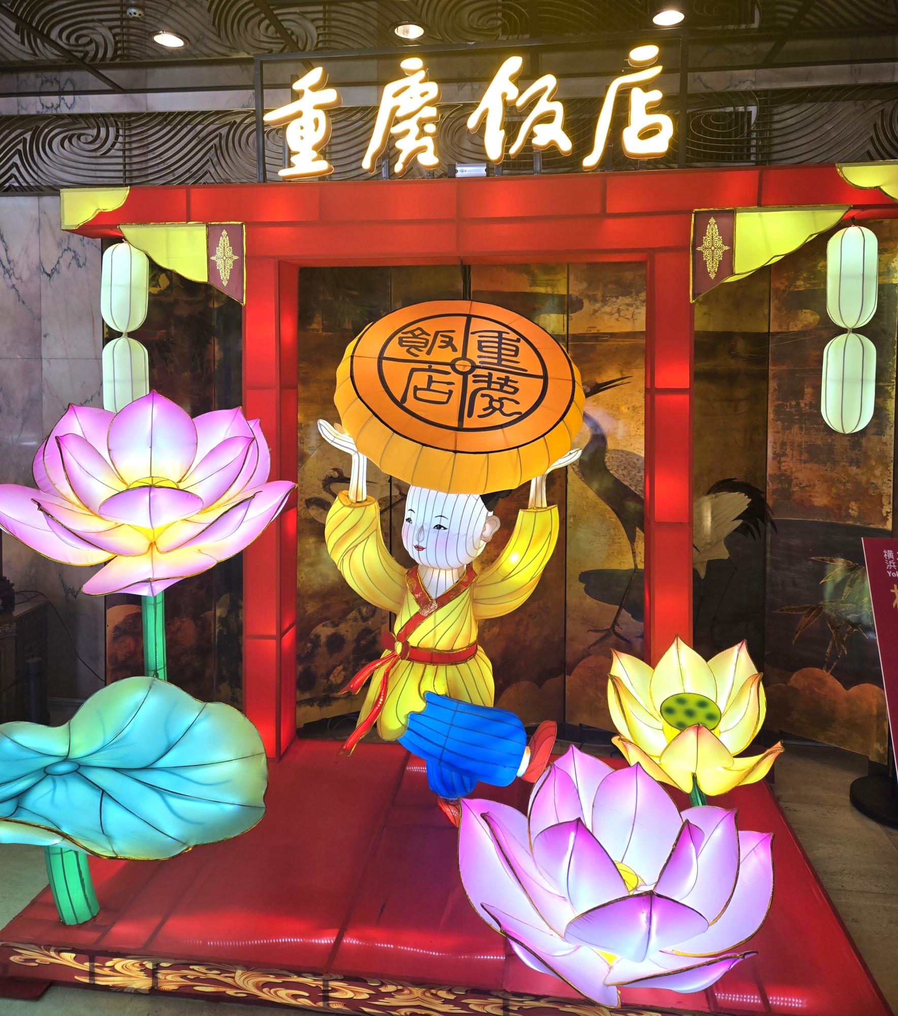 ローズホテル(横浜中華街)のランタンオブジェは「重慶坊や」。片足を上げた軽快な姿と、取り巻く蓮の花が美しい。
