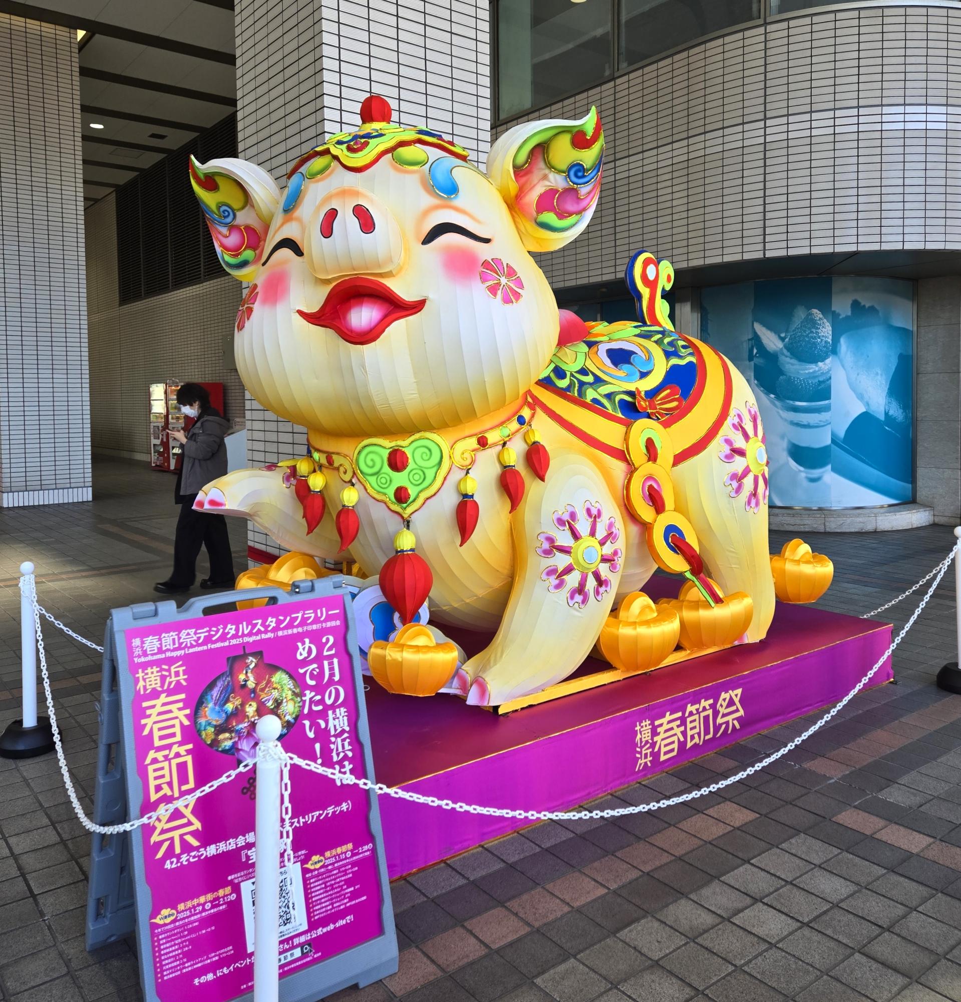 続いて横浜駅・桜木町駅方面へ。今年の筆者のお気に入りは、そごう横浜店会場(2階ペデストリアンデッキ)の「宝金豚」。宝の金の豚とは…このめでたさにあやかりたい!装飾もカラフルで、実におしゃれなブタである。