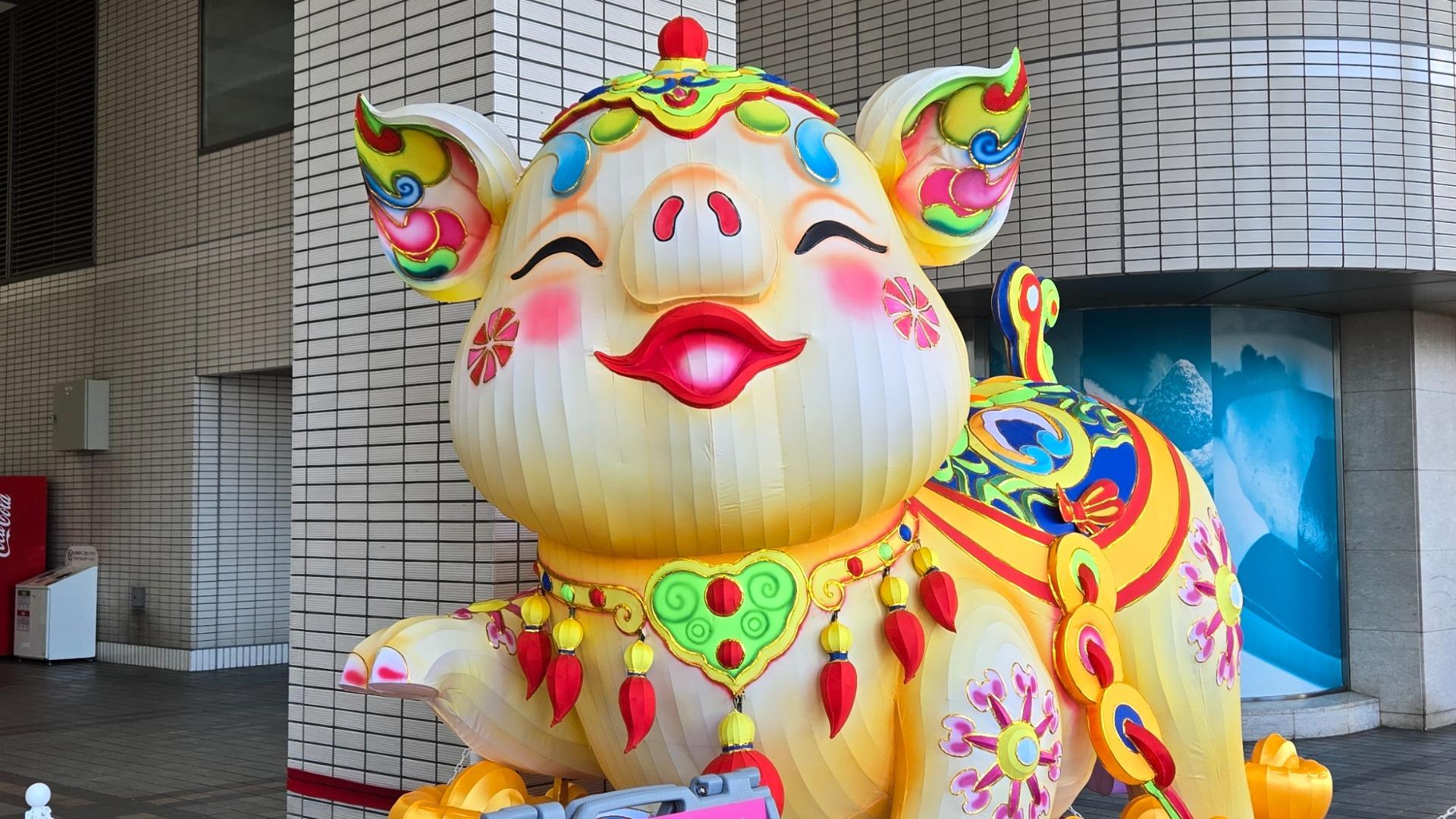 続いて横浜駅・桜木町駅方面へ。今年の筆者のお気に入りは、そごう横浜店会場(2階ペデストリアンデッキ)の「宝金豚」。宝の金の豚とは…このめでたさにあやかりたい!装飾もカラフルで、実におしゃれなブタである。
