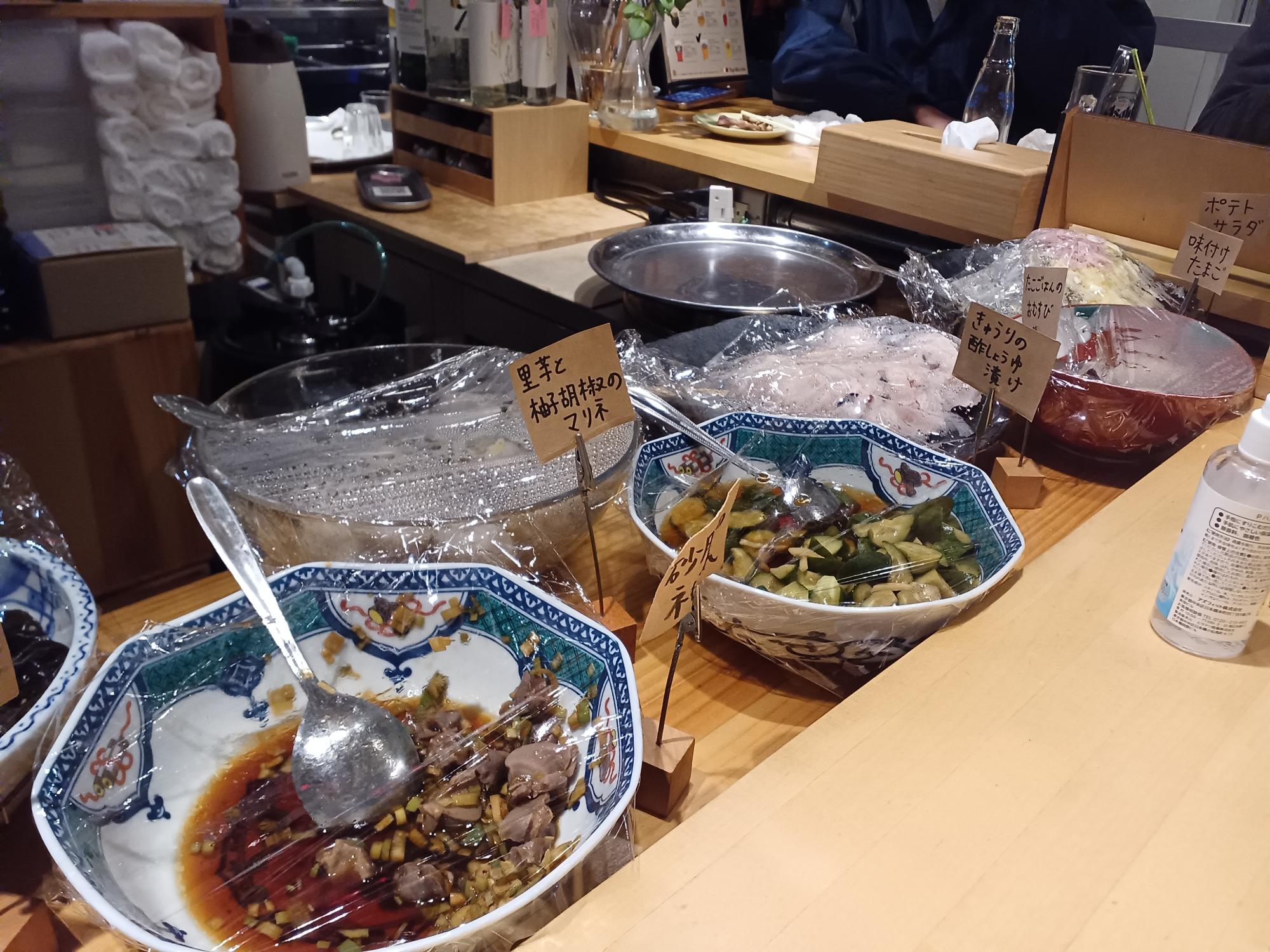厨房を囲むカウンター席。大皿で用意されたつまみをのぞき込む。