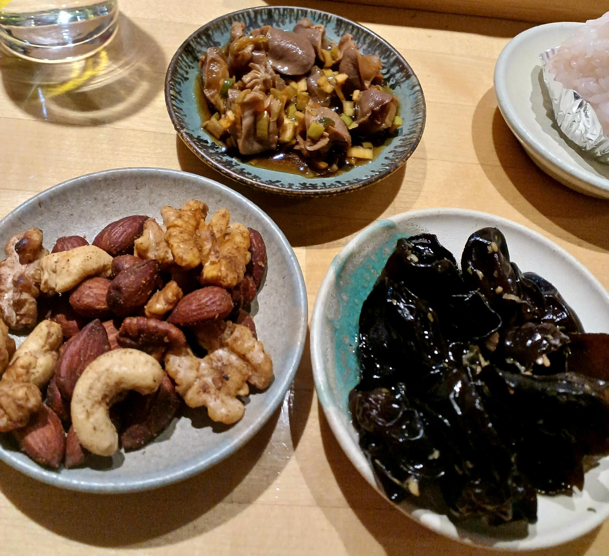 お通しとしてつまみを三品選ぶ。素材とバリエーションの妙に、早速迷う。写真奥から時計回りに、「砂肝のねぎだれ」、「きくらげの香菜和え」、「スパイシーナッツ」。どれも手間を惜しまずに仕込まれたように感じる。