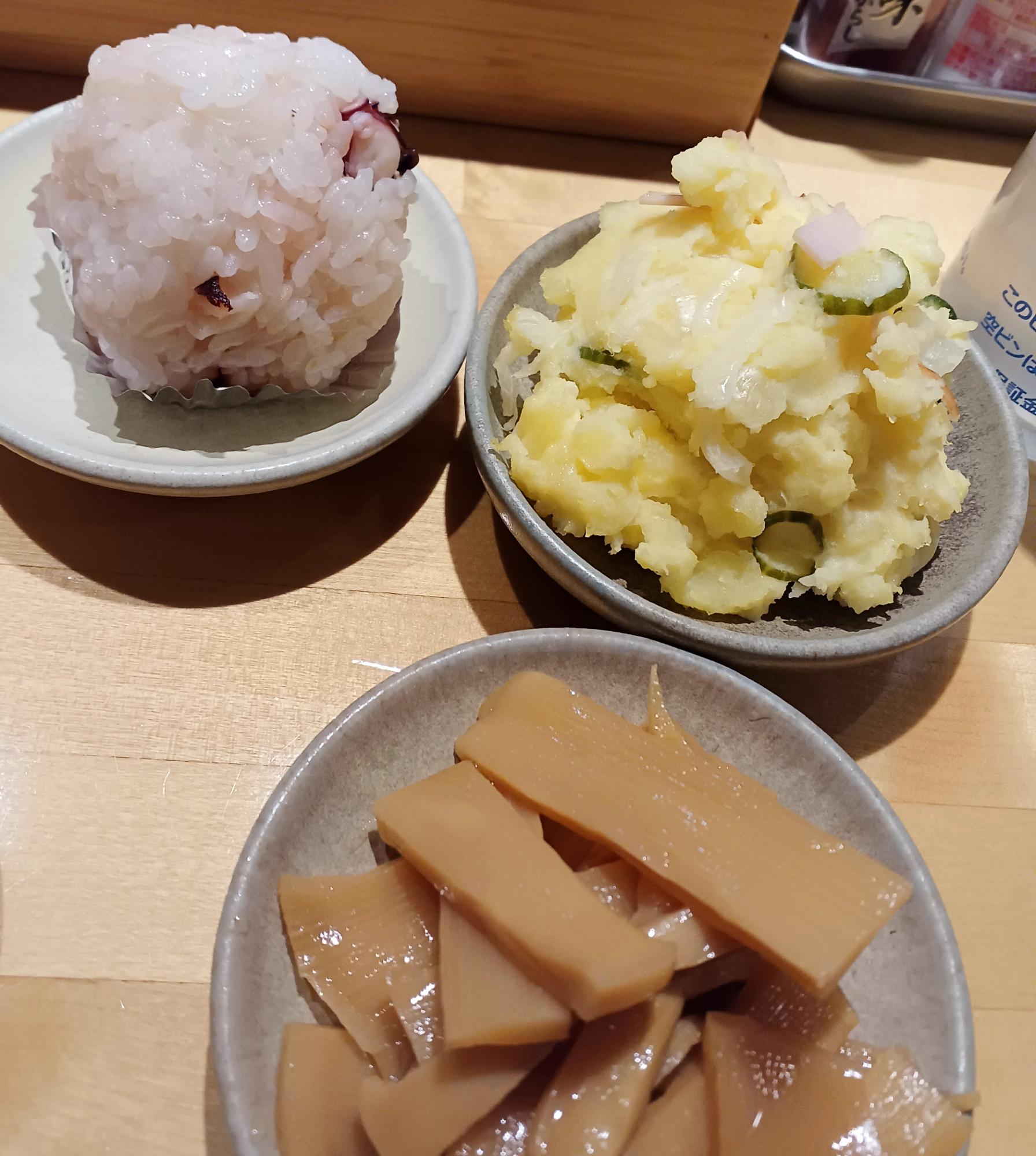 あるいは「たこごはんのおむすび」、「ポテトサラダ」、「メンマの甘煮」という選択も。小皿にたっぷりと盛られて、軽くつまむだけの夕飯ならこれだけで済みそうなボリュームだ。