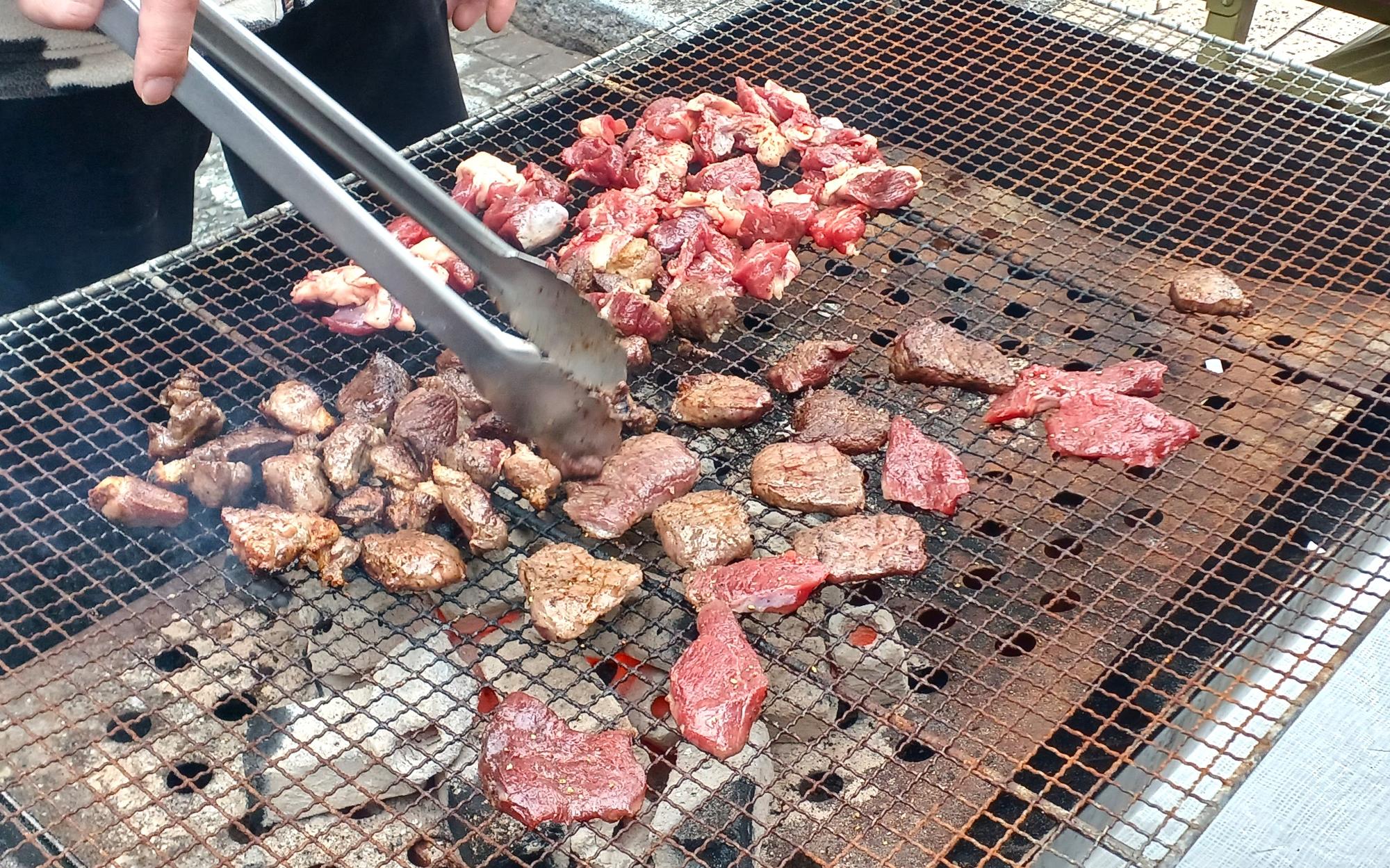 吉田町名店街会の主催。近隣飲食店18店舗が、それぞれに趣向を凝らしたジビエ料理を提供した。神奈川県などで獲れたジビエ(野生鳥獣の食肉)がイベントの主役だ。炭火焼きの調理が食欲を誘うのは、「横浜ベイブルーイング」(横浜市中区)。