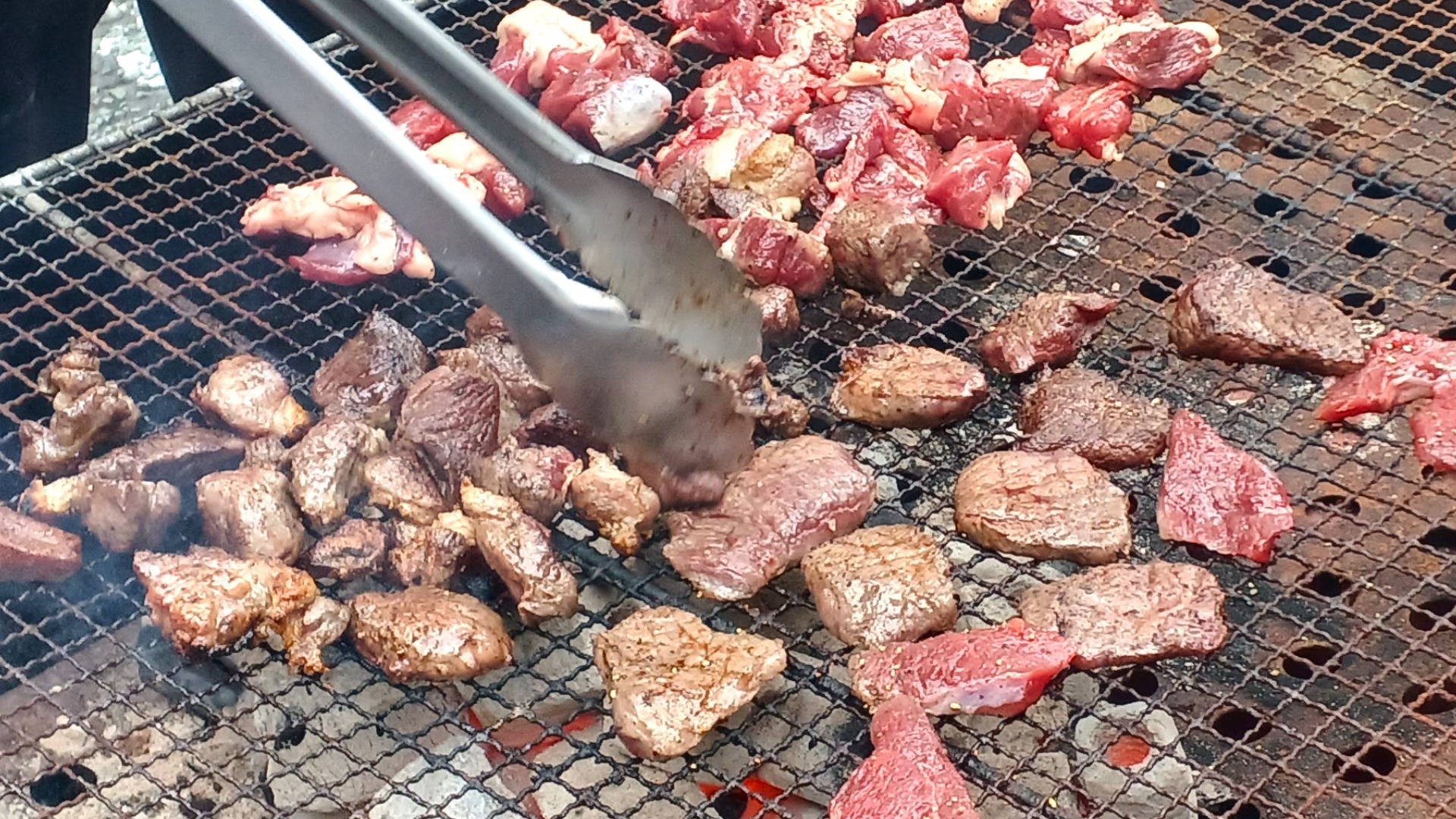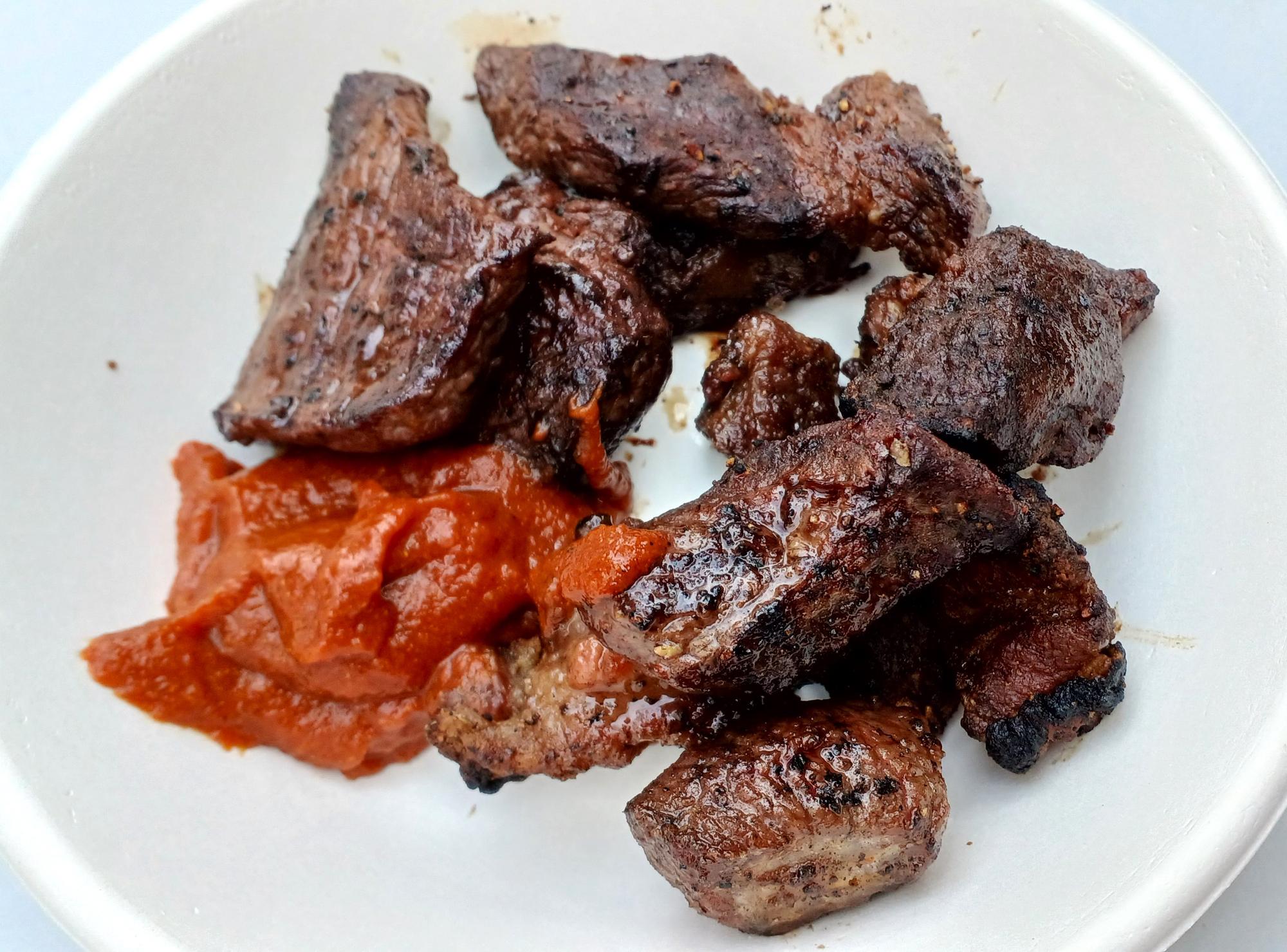 写真手前のサイコロカットのものがイノシシ、少し平らなカットに見えるのがシカだ。野生生物ならではのしっかりとした噛み応えがあり、肉を食べているという実感が強い。