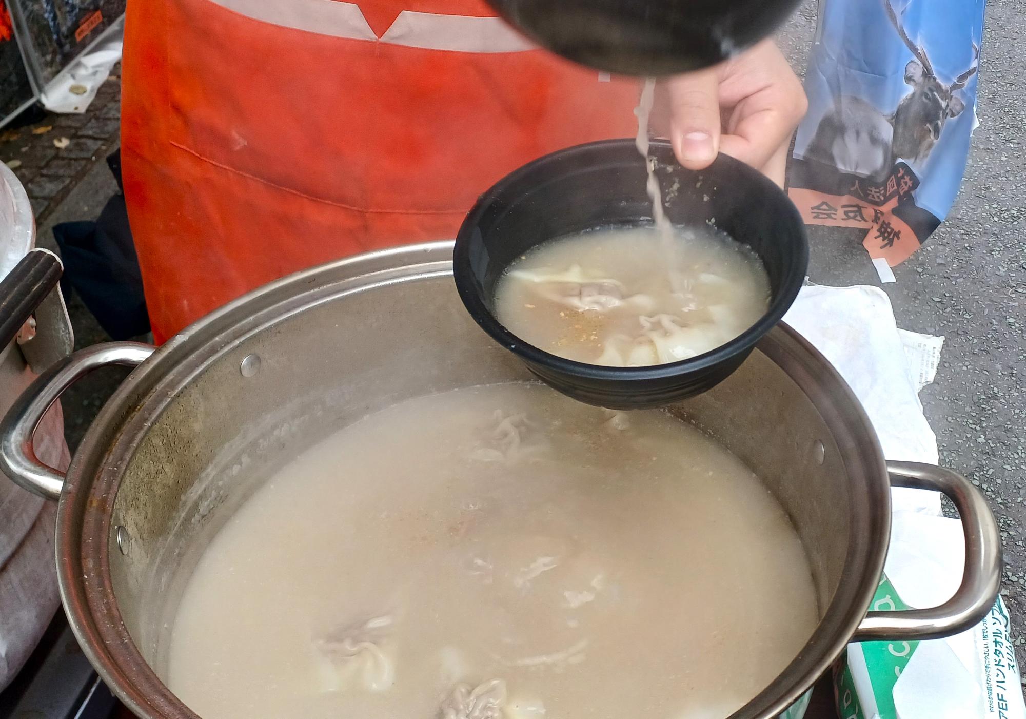 具にはゴロッとした鹿肉が入っていて、食べ慣れた豚ひき肉のワンタンとは一味違う。よく炊かれたスープも体を温める。