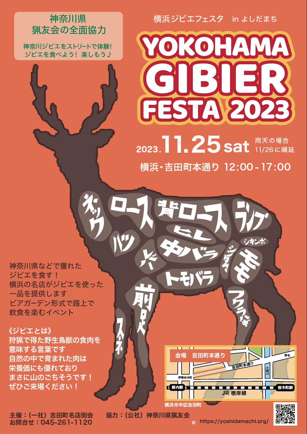 「横浜ジビエフェスタ2023」が11月25日に行われ、会場となった吉田町本通り(横浜市中区)にはシカ・イノシシ・クマなどのジビエ料理を提供するブースが出てにぎわった。