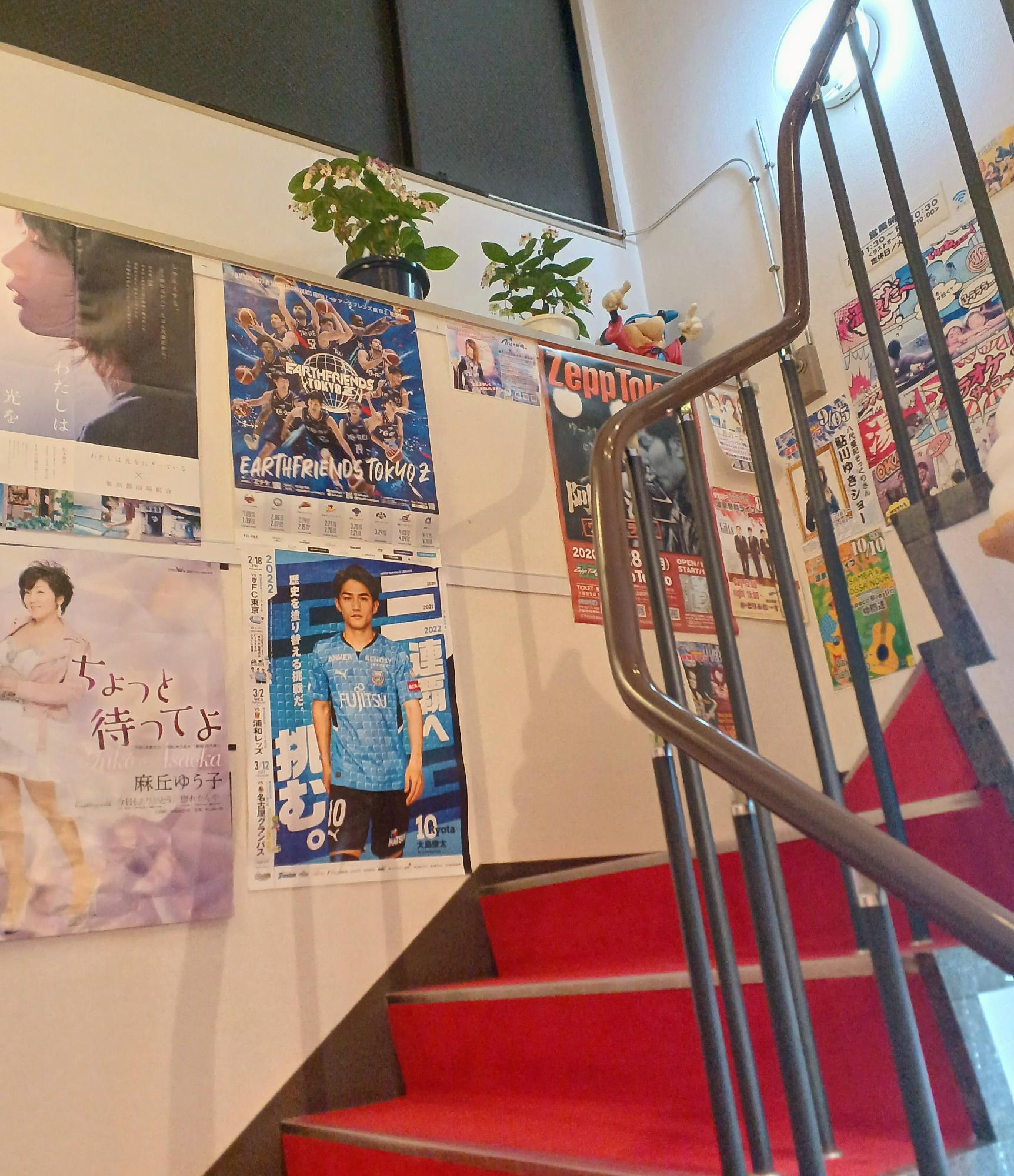 と、上にいく階段がありますね。所狭しと貼られたポスターの数々。