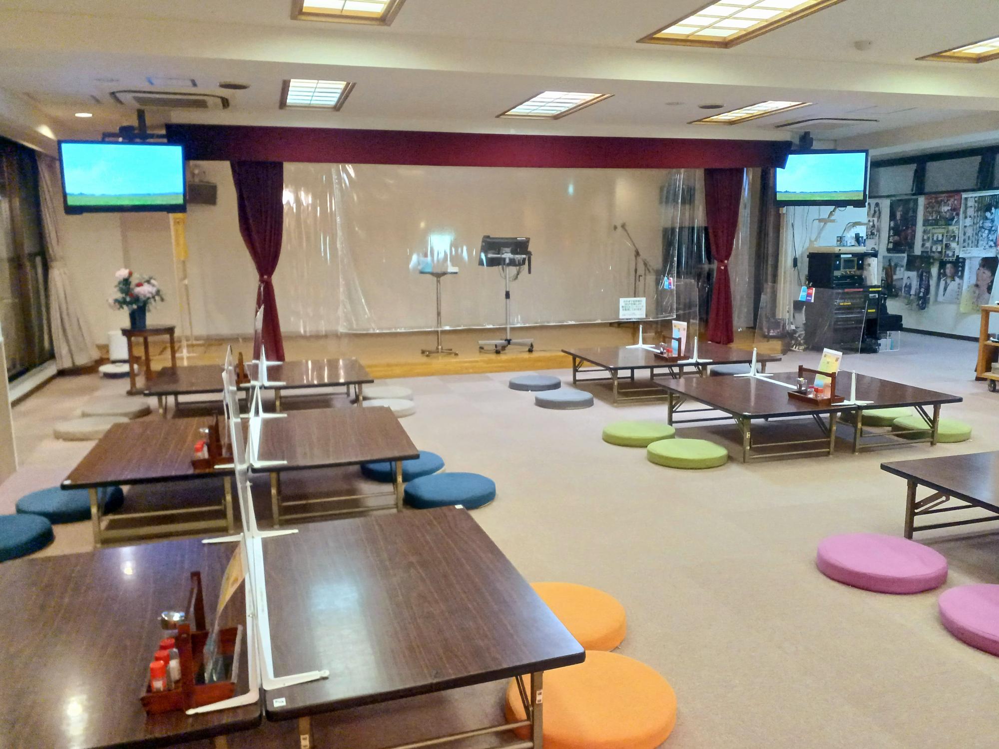 はい、宴会場!その名も「YCKホール」。広い!座布団がカラフル!!こちらのスペースは休憩スペースとしても利用できます(入浴後無料)。定期的にライブイベントなども開催。