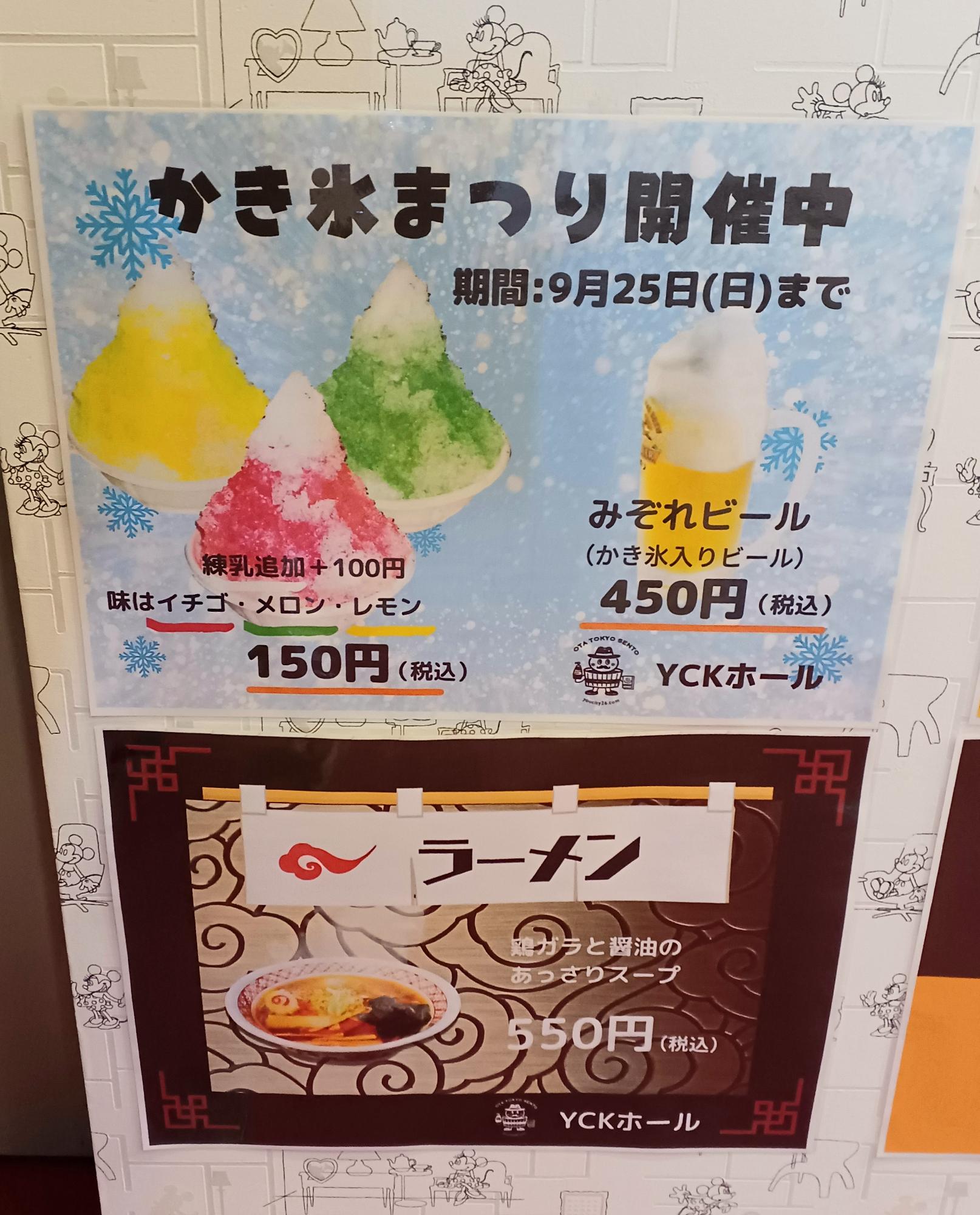 花よりだんご、お湯より飲食…といった調子で銭湯巡り。JR蒲田駅から徒歩5分の「ゆ~シティー蒲田」では、9月25日まで「かき氷まつり」を開催中です。風呂上りにかき氷のメニューを見て、頼まずにいられるか?いや、いられない!!