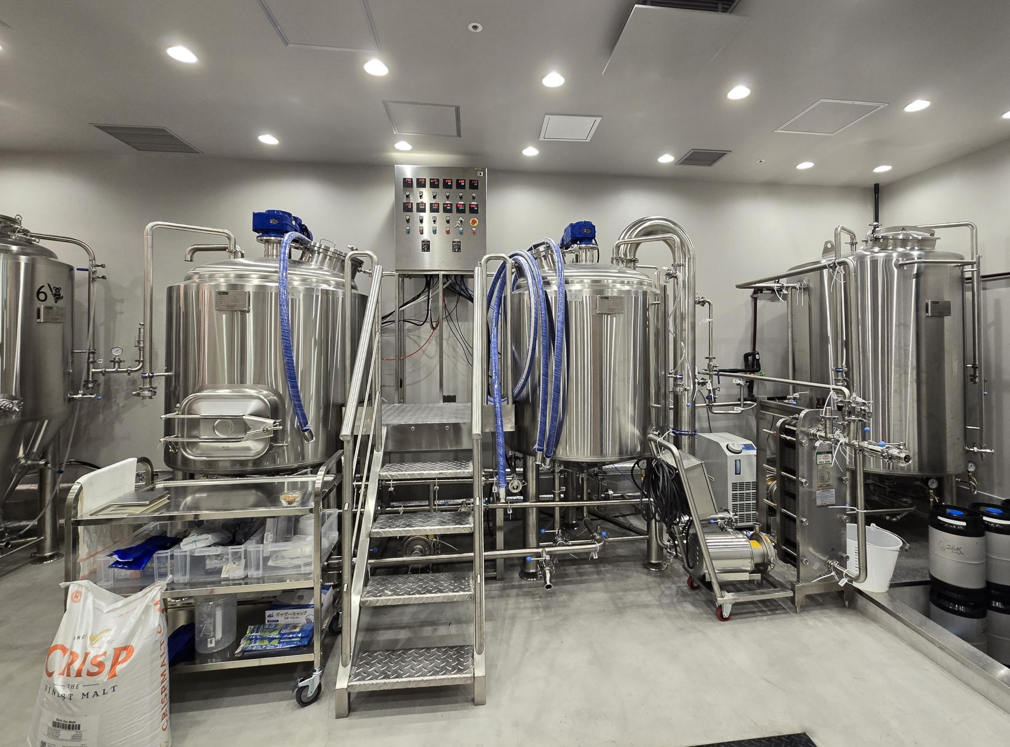 醸造タンクが3つ、発酵タンクが6つ並ぶ。店内醸造の第1号は、8月以降に提供予定だ。